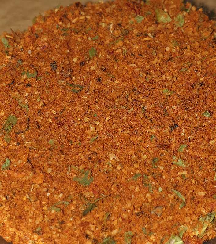 Zutaten: Kreuzkümmel, Knoblauch, Paprika, Pfeffer, Zitronenschale, Sumach, Petersilie, Cayennechili, Koriander