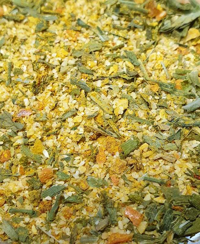 Zutaten: Knoblauch, Zwiebeln, Ingwer, Basilikum, Pfeffer, Koriander, Kurkuma, Schnittlauch, Liebstöckel, Bärlauch, Salz, Nelken, Chili, Petersilie, Karotten, SELLERIEsaat